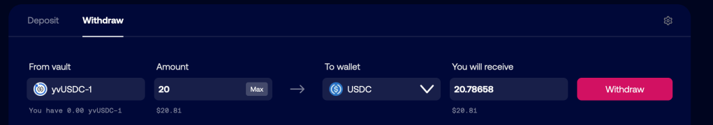 The example below uses the Metamask wallet to deposit USDC using the Ethereum Blockchain into one of Yearn’s Finance Vaults for earning yield.