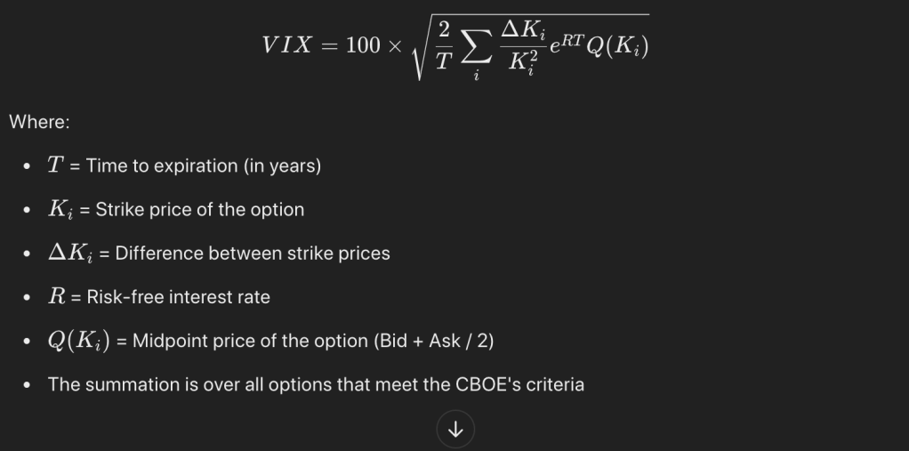 The VIX is calculated using a weighted average of implied volatilities from a wide range of S&P 500 index options — both calls and puts — with expiration dates around 30 days out.