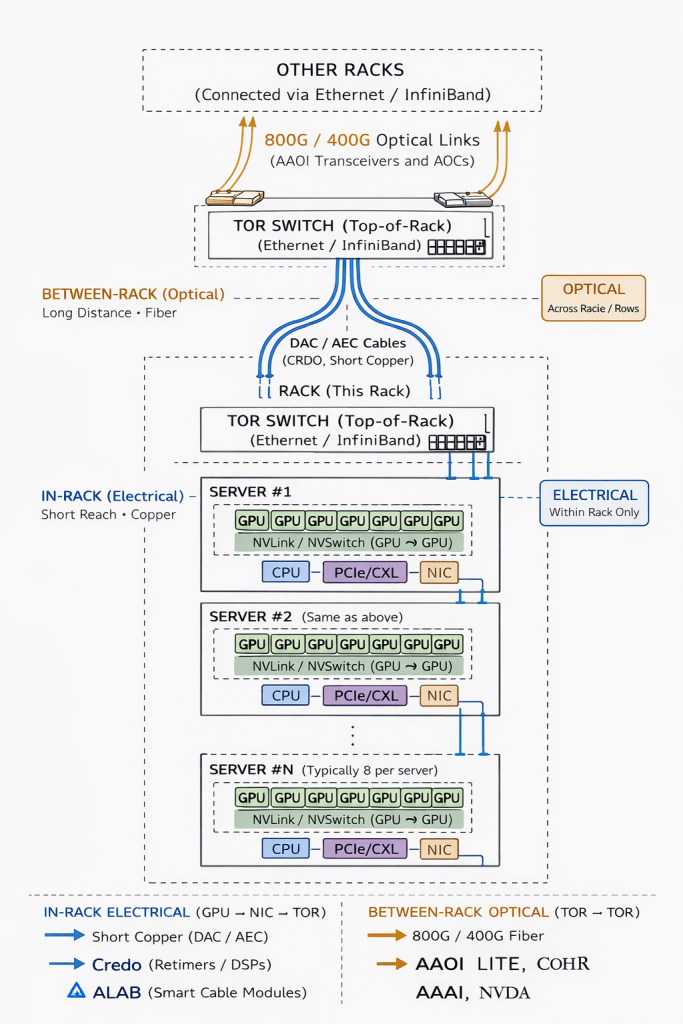| 3. Optical Between Racks | Optical Transceivers | AAOI, Innolight, Coherent | 5–100m+ | Inter-rack AI networking |