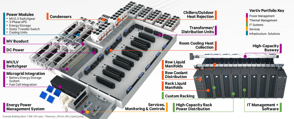 Vertiv’s product portfolio is diversified across multiple critical infrastructure segments. These are the primary categories, along with their approximate contribution to the company’s revenue: