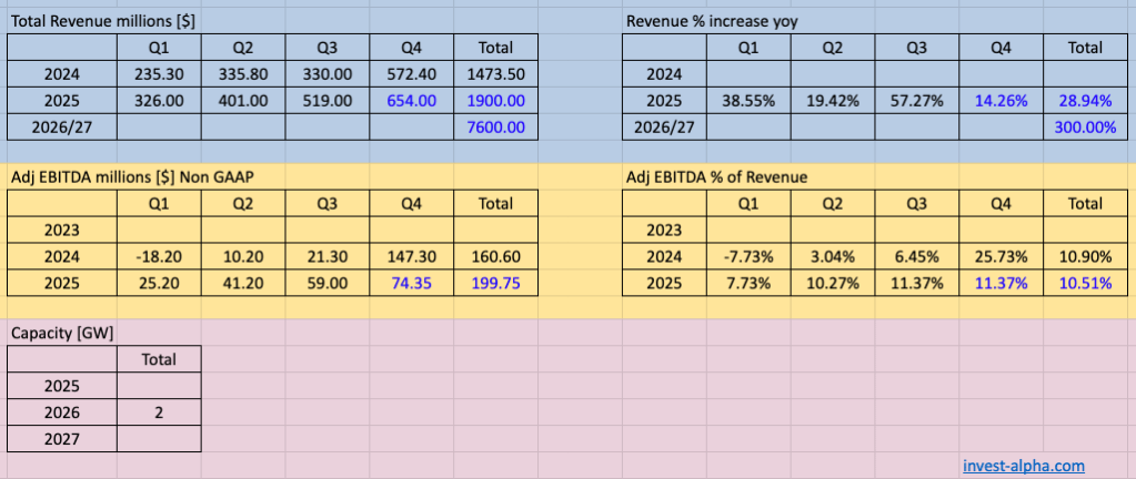 - Management hinted at a 4X of 2025 revenue potential with a rapid doubling of capacity to 2GW by end of 2026. Unclear if all of it will be realized in 2026 but hinting at acceleration.