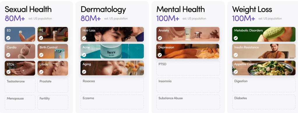 They specialize in conditions that are often not fully covered by insurance where people are already used to paying out-of-pocket or are frustrated with traditional healthcare access. The company’s services are in the areas of sexual health, hair loss, mental health, dermatology, and weight management.